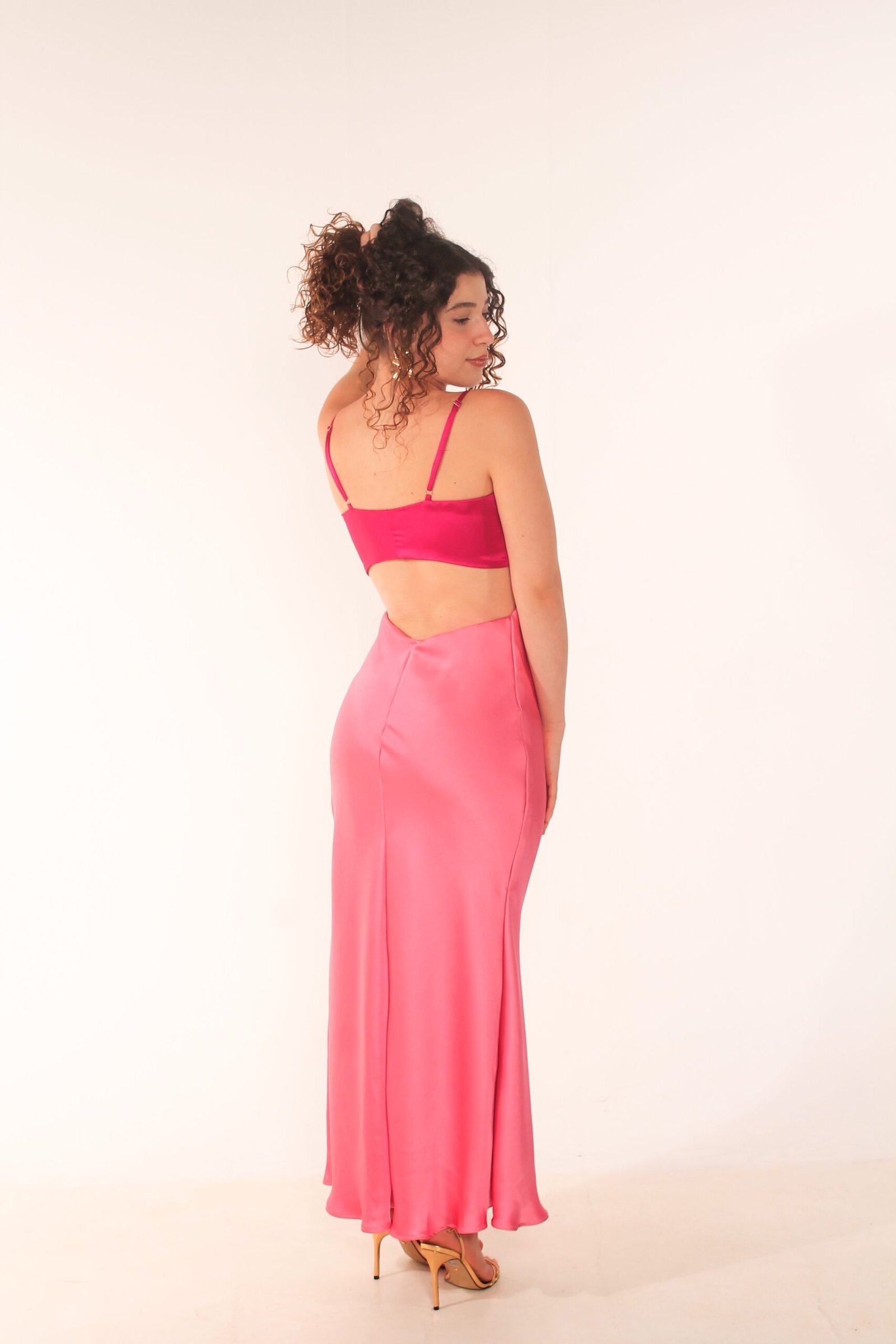 Vestido longo bicolor em Cetim com abertura nas costas, elástico na parte superior das costas para melhor caimento, alça fina de regulagem e zíper invisível na lateral.